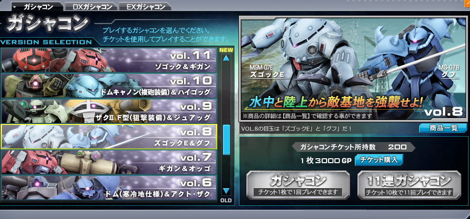 グフ狙いでVol8のガシャコンを回します。まず200枚買ってトライ。