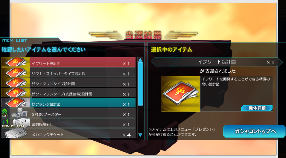 今回のGPガシャコンで連邦はピクシー系、ジオンはイフリート系それぞれ二機解放ということで、連邦、ジオン共に特殊格闘二機がともにGPガシャコン落ち。というわけで、戦場ではピクシー、イフリート増えてますね。