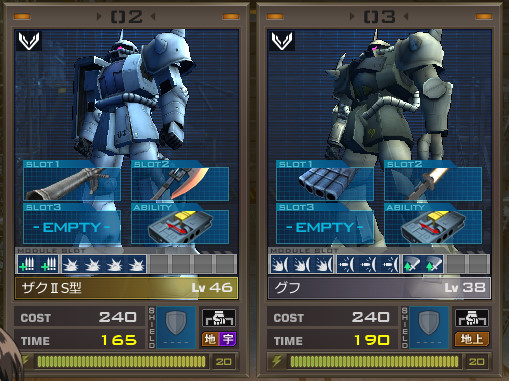 個人的にお気に入りのグフ。コスト240なので再出撃時間が短めなのがいいところ。また低コスト機なので、モジュールも付けれる。爆発装甲IIIと実弾装甲III(アレックスのガトリング対策)を付けて、なるべく死なないように。スロットが2つ余っていたので、ついでに格闘間接制御IIも付けておいた。これで格闘でもちょっとだけ有利になれる。下記のザクIISとは同じコストだが、モジュールのスロットはこちらのほうが2つ多い。なので、その利点を少しでも利用しておこう。待ち時間は長くなるけど。フィンガーバルカンでバリバリ撃ちつつ、ヒート剣で敵を切れればヒャッハーである。そして2機以上切れればアドレナリンブシャーである。グフの金がほしくてガシャコンをまわしているが、いまだに出ない。いや、金とはいわず銀の機体特性がコンバットカスタムの銀でもいい。それがなかなか今の機体の色を変えれない要因である。